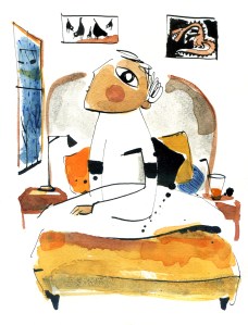 A la imatge que ocupa les dues pàgines veiem a la nena que és la que explica la història enmig d’una habitació dibuixada de manera exquisida, a llapis i amb uns tocs de color (només els primaris: vermell, groc i blau) que destaquen els aspectes més singulars. Després d’una bona estona mirant i remirant, descobreixes, per exemple, les marques que hi ha al marc de la porta que són els que molts tenim en algun lloc de la casa i que assenyalen com van creixent els fills. També veiem una peixera i una cadira que seran rellevants en les pàgines següents. I si esteu alerta veureu un autobús petit de color groc a tocar de la casa de nines. L’anireu veient més endavant. I més enllà de la porta, la taula parada amb l’esmorzar, un detall delicadíssim.