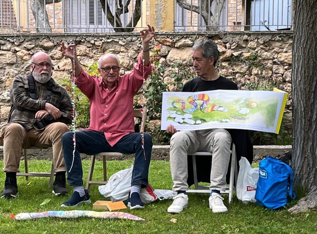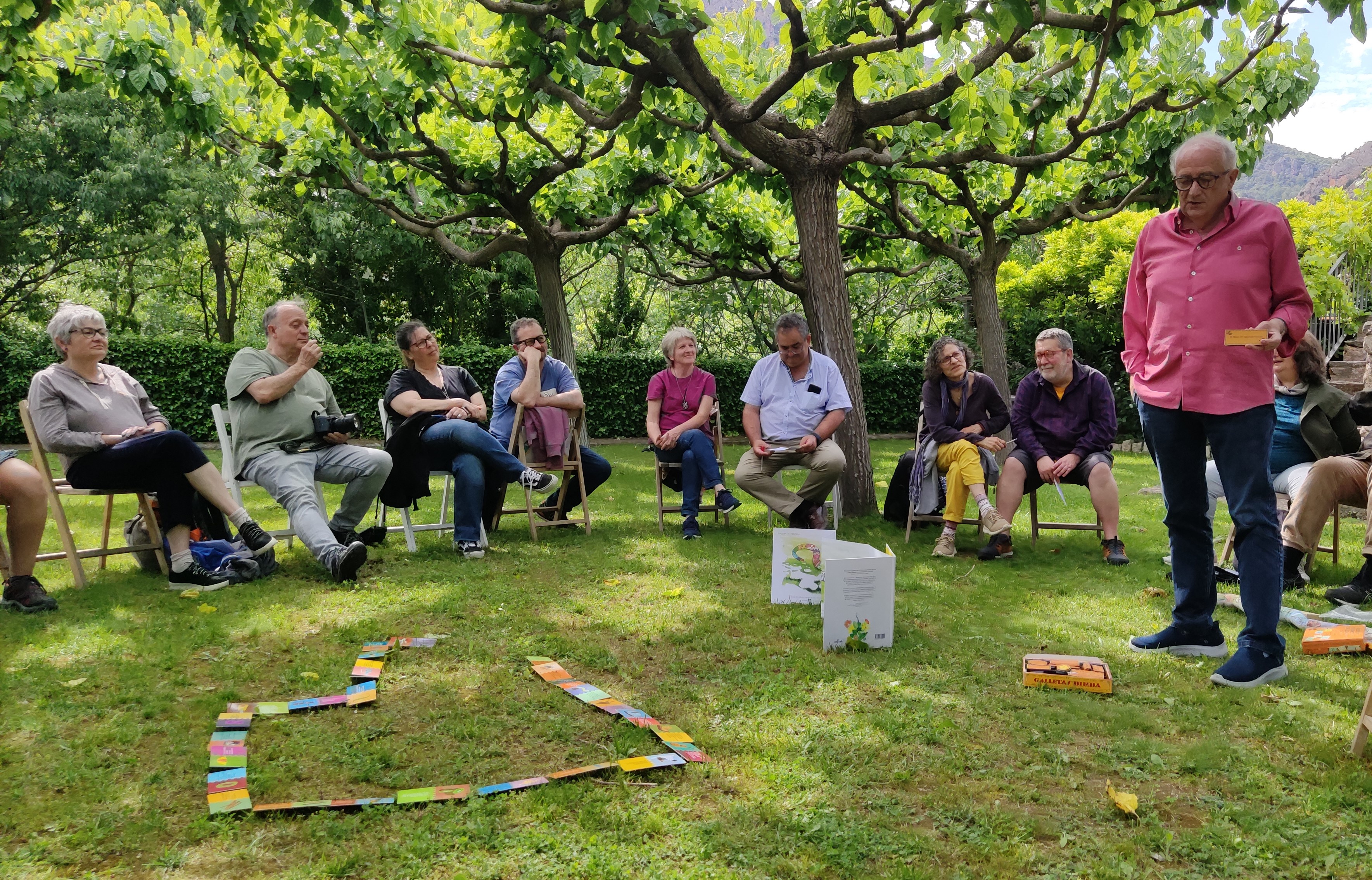 Després de dinar, ens vam reunir sota les moreres de Cal Pedret on vam conèixer de primera mà les darreres publicacions i els projectes futurs d’aquest autor peramolí que, amb la seva generositat, ens va fer estimar una mica més la poesia.