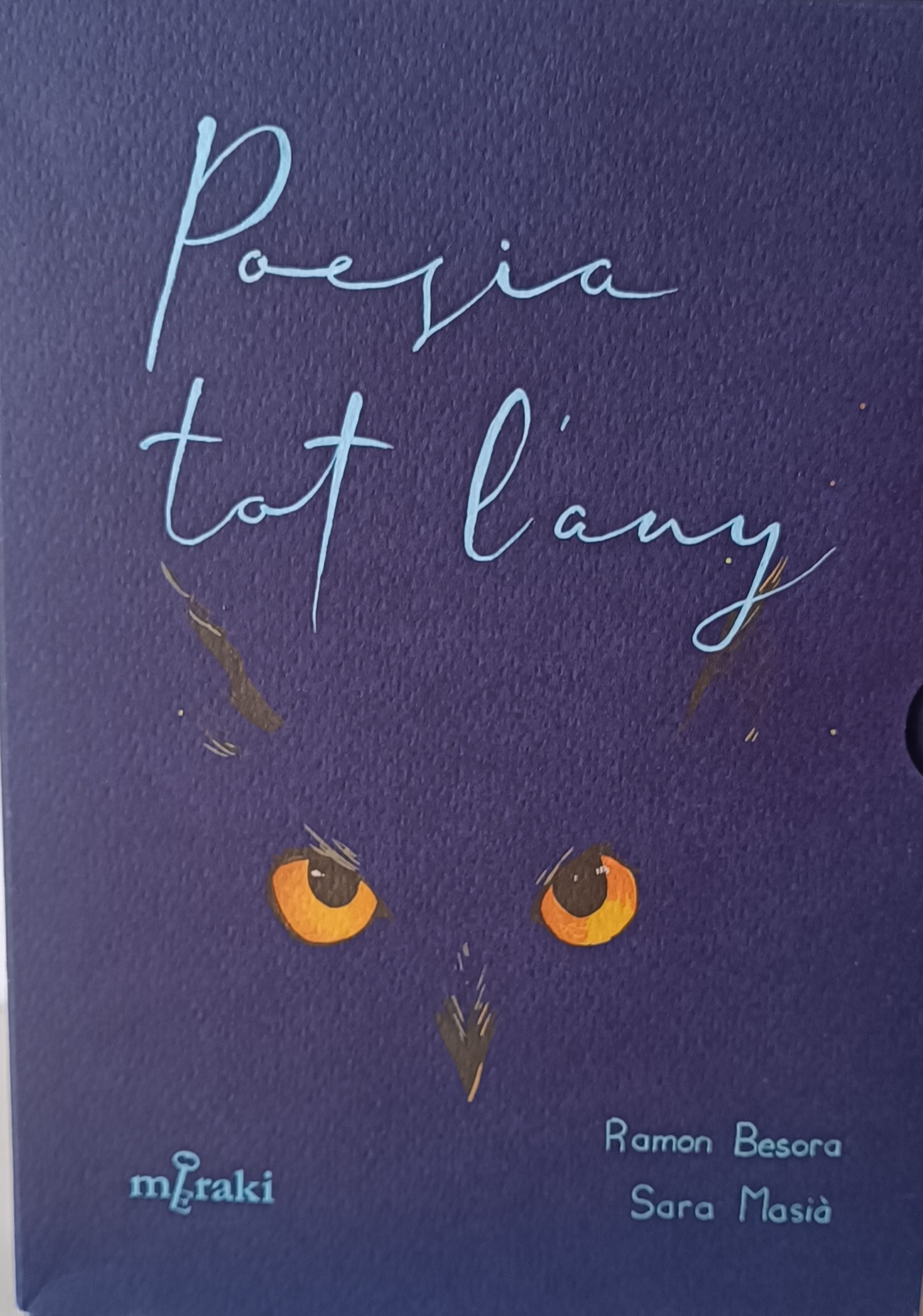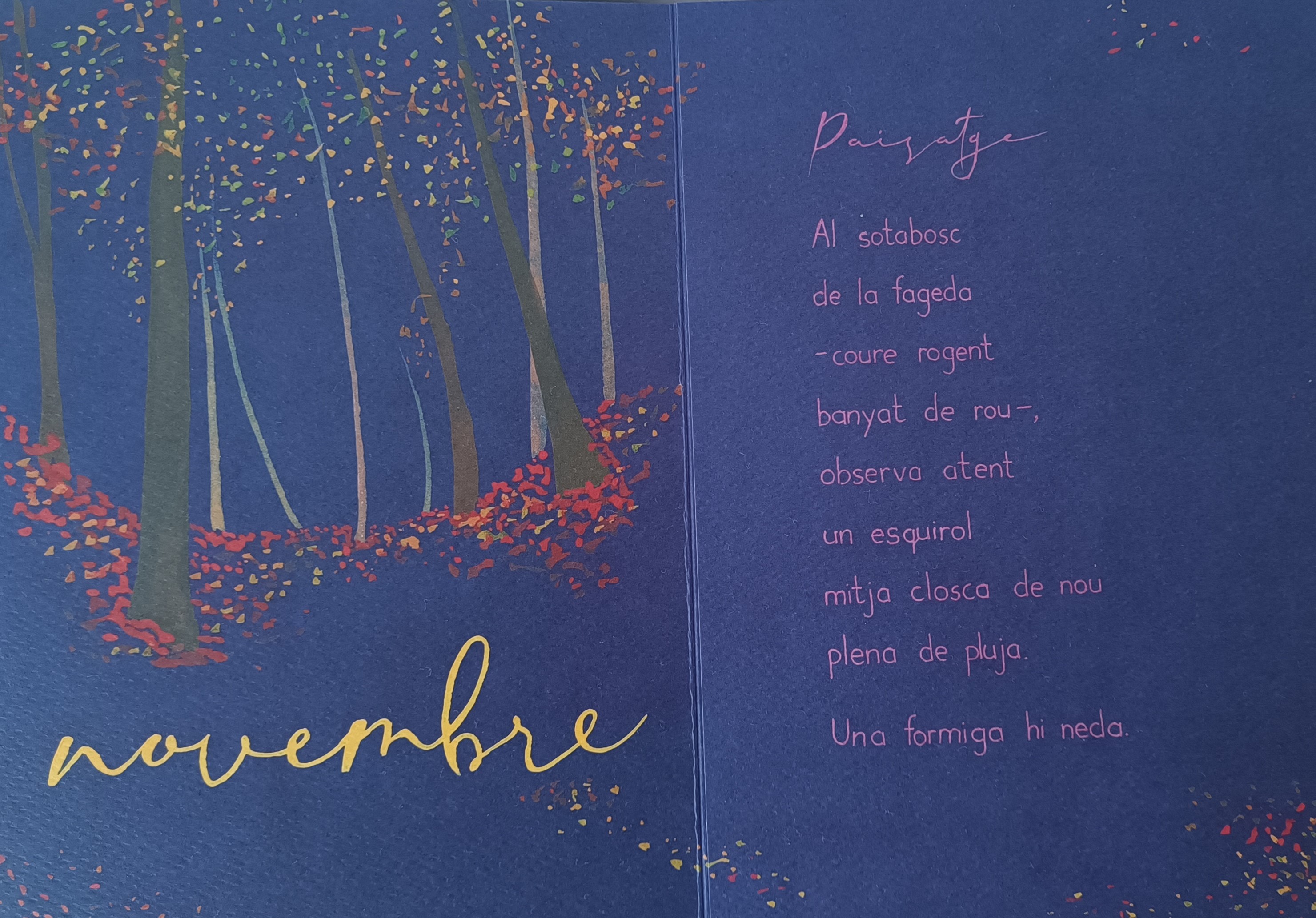 Hem comentat que la seva mirada és la d’un editor i es nota en la gosadia de fer un leporello, un llibre que es desplega com un acordió de 3,80 metres, els poemes sobre fons blau que és el color més difícil per a l’impressor, i el text escrit a mà amb molta traça per la Sara Masià, autora també de les il·lustracions.