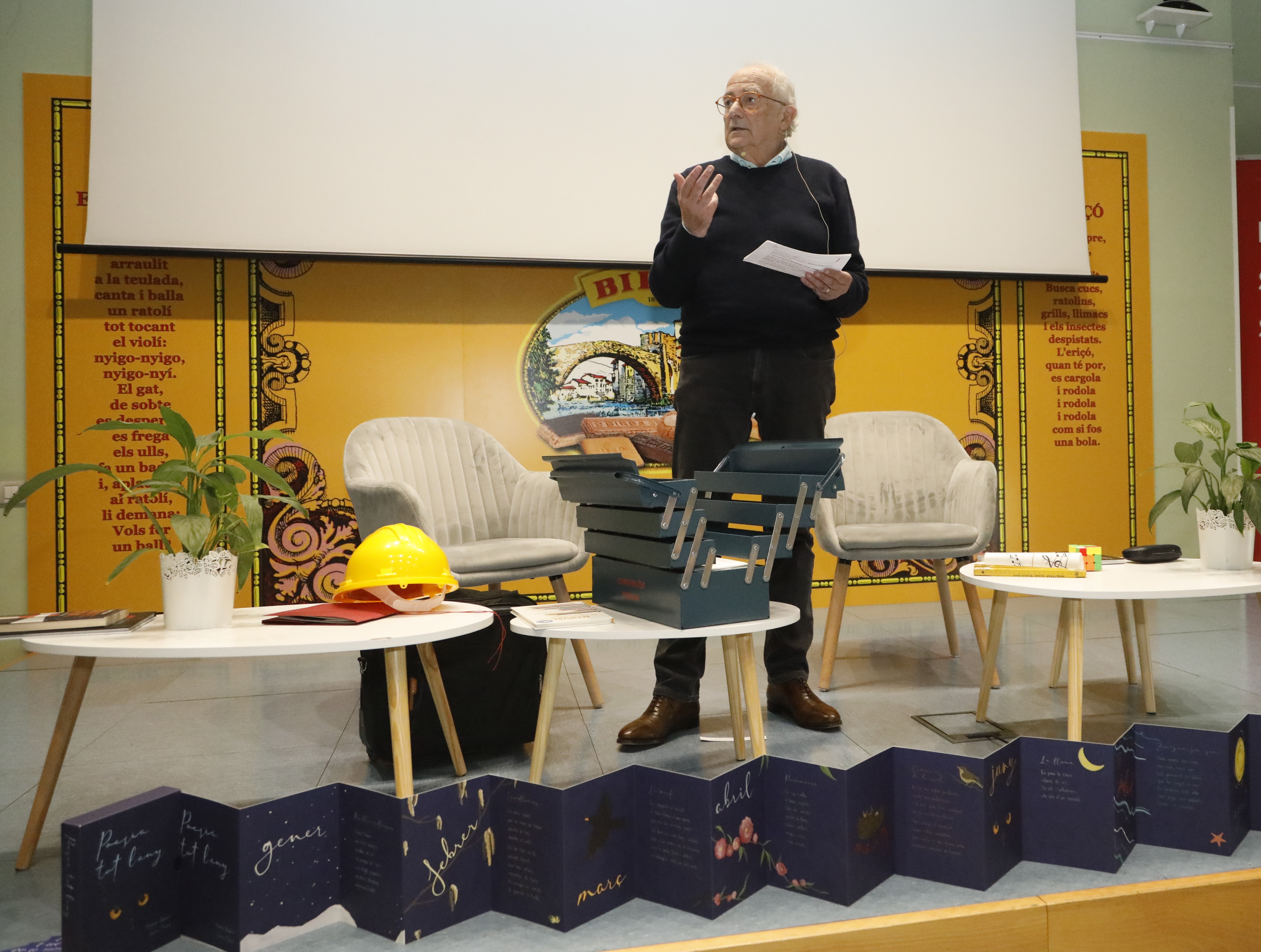 Abans d’arribar a l’Assortiment, en Ramon va explicar d’on ve tot plegat i va fer referència als seus inicis com a mestre, ara fa més o menys 45 anys, quan estava a l’Escola El Puig, a Esparreguera, i va començar a interessar-se per l’obra d’en Marti i Pol i a inculcar als seus alumnes l’estimació per les paraules, per les metàfores, per la mètrica i la rima. Va passar unes imatges dels treballs dels infants, de l’exposició Sarpingàlia, dels llibres obra dels alumnes que van ser publicats i que van deixar màcula en molts d’ells.