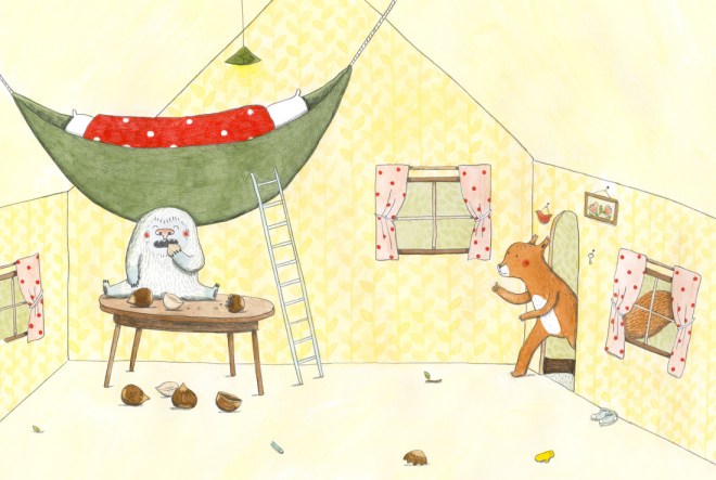 La gràcia és que a cada pàgina doble trobem a l’esquerra una frase i a la dreta una imatge que complementa el relat.