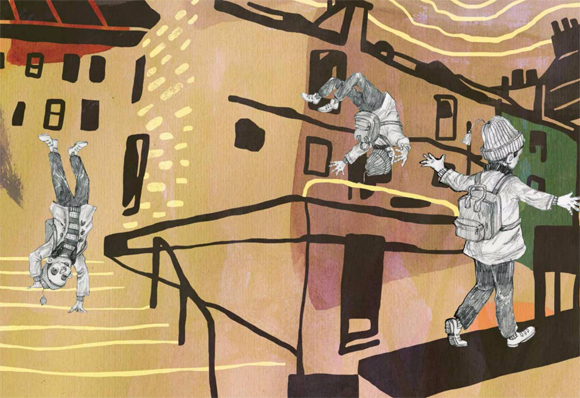 L’Adrian és un infant de deu anys que cada dia, quan va a l’escola, nota una certa ansietat, un rau-rau que li regira la panxa. El veiem a les primeres pàgines caminant solitari i patint les burles d’alguns companys de l’escola. Quan són a classe i el mestre li demana de llegir en veu alta, l’Adrián es bloqueja («A veces me toca leer. El corazón me late con fuerza y la cabeza se nubla.Y las mejillas se me ponen muy rojas. EL TIEMPO SE DETIENE») i el seu pensament se’n va lluny, molt lluny, al món del circ, on ell es veu com un trapecista.