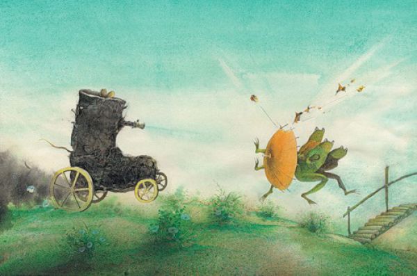 L’exemplar el tenia guardat fins que he vist “La feria de medianoche” de Gideon Sterer, publicat per Edelvives. Va ser una recomanació de la llibretera Montse Marcet. És un àlbum sense text (bé, només hi ha una petita explicació a la contraportada i algun rètol en alguna pàgina) que ens narra l’arribada d’una troupe de les que arriben a les ciutats i pobles quan és festa major i que tots coneixem. En aquest cas, però, el recinte firal està a tocar d’un bosc i durant la nit, quan la fira és buida, els animals s’aventuren a passar una nit màgica i memorable.