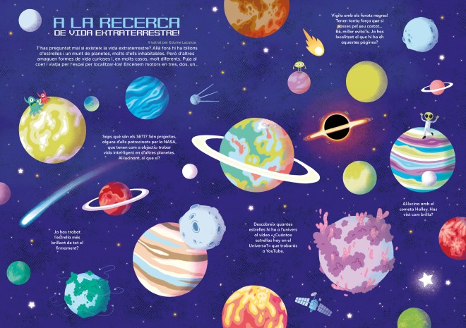 També fa una pinzellada a problemes que se’ns escapen de les mans, com la brossa espacial perquè l’ésser humà ha embrutat la Terra. I també ha convertit l’espai en un abocador. Al voltant de la Terra hi ha piles i piles de fragments de brossa espacial que viatgen a una velocitat altíssima per les òrbites terrestres i posen en perill els satèl·lits i els astronautes que es mouen per l’espai. Sort que la NASA i l’Agència Espacial Europea tenen un pla!