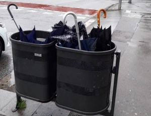 En tornar, em va tocar fer un bon tros a peu i el vent em va girar el paraigües quatre vegades. La darrera, va quedar inservible i va acabar a la paperera. Vaig seguir caminant i vaig observar com a d’altres papereres hi havien deixat altres paraigües, també inservibles, amb les barnilles doblegades o trencades.