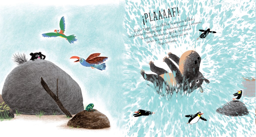 A l’hora d’esmorzar, mentre els seus companys estan tranquils menjant-se els entrepans, la Zara que no pot estar-se quieta, es cola discretament a la gàbia del gran tigre, i comença a fer-li pessigolles amb una ploma que ha agafat a l’aviari.