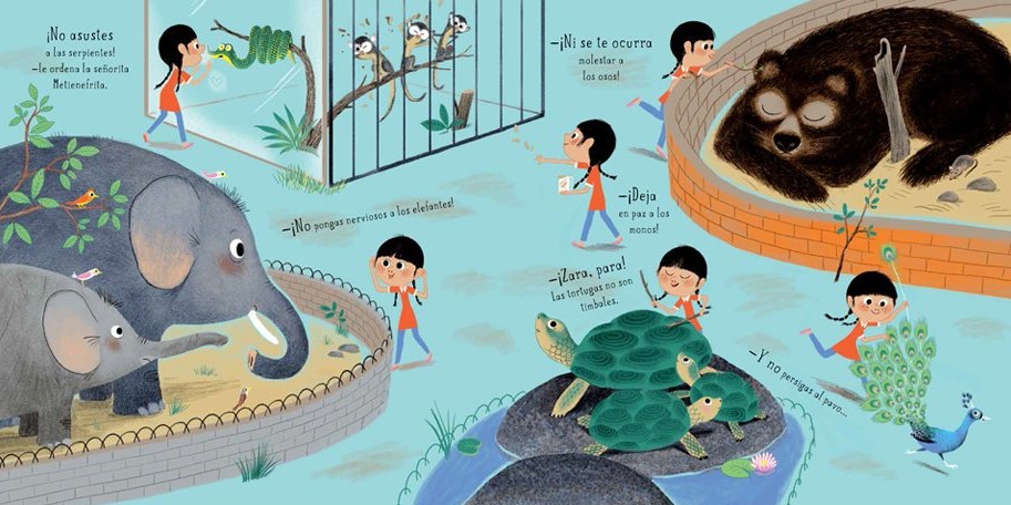 El relat ens situa en el dia que la classe va de visita al zoo. La Zara està molt contenta, vols conèixer tots els animals i va amunt i avall, malgrat la mestra li va dient NO toquis això, NO facis allò, etc. Juga amb els micos, colpeja les closques de les tortugues com si fossin tambors i la mestra la va renyant i recordant que, sobretot, no ha de fer pessigolles al tigre.